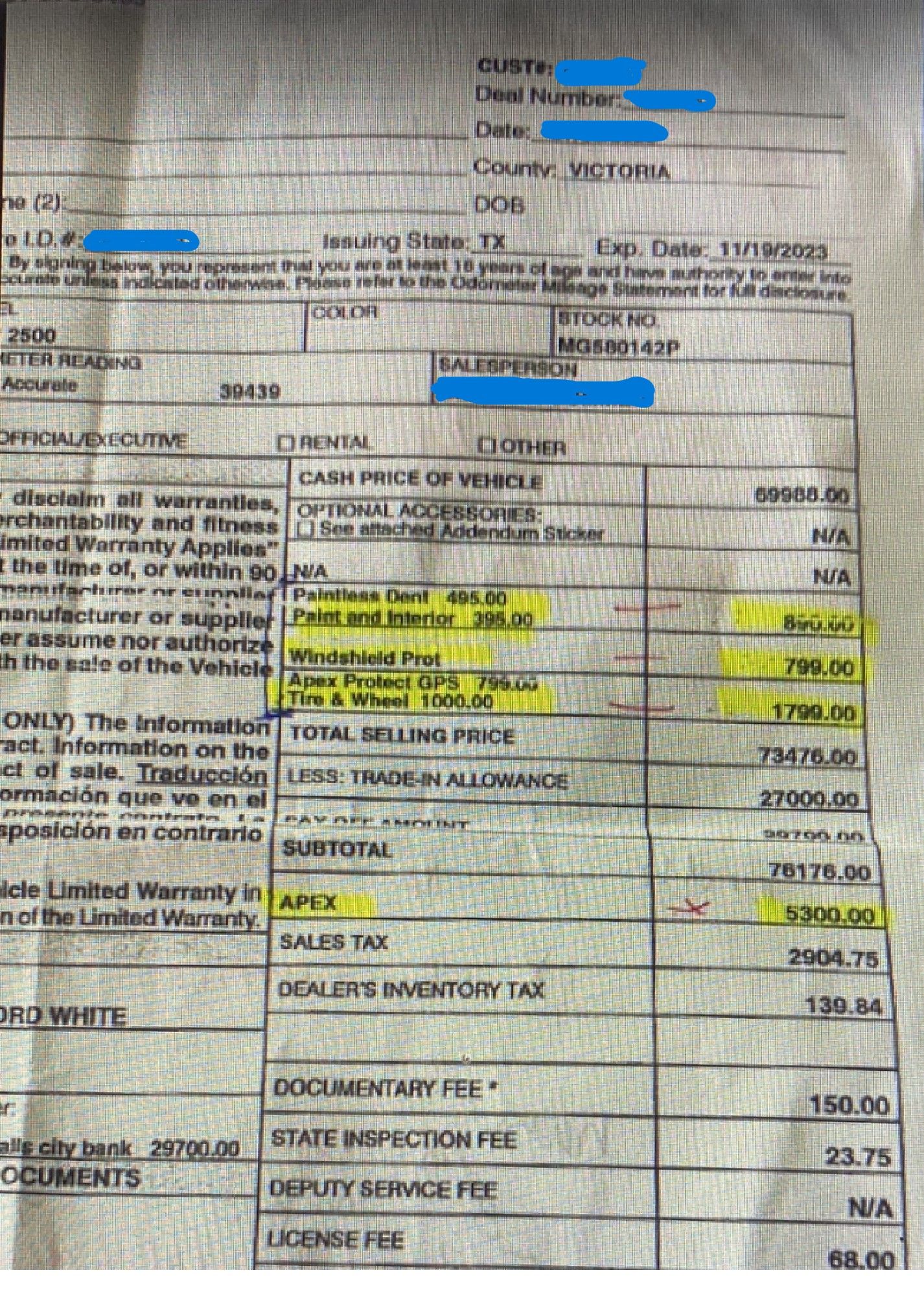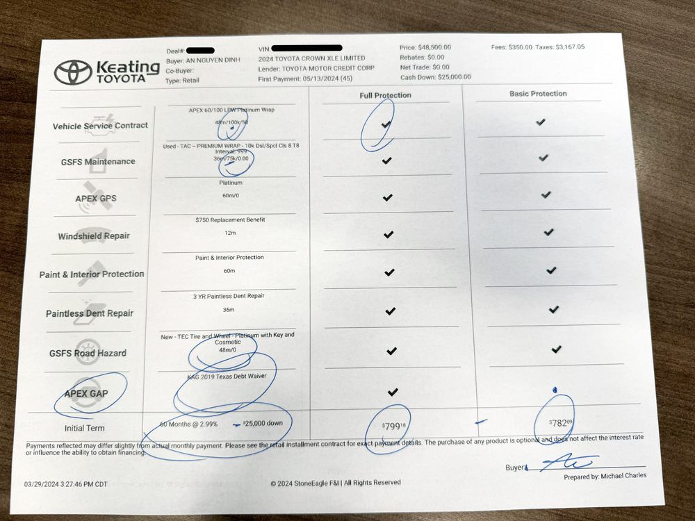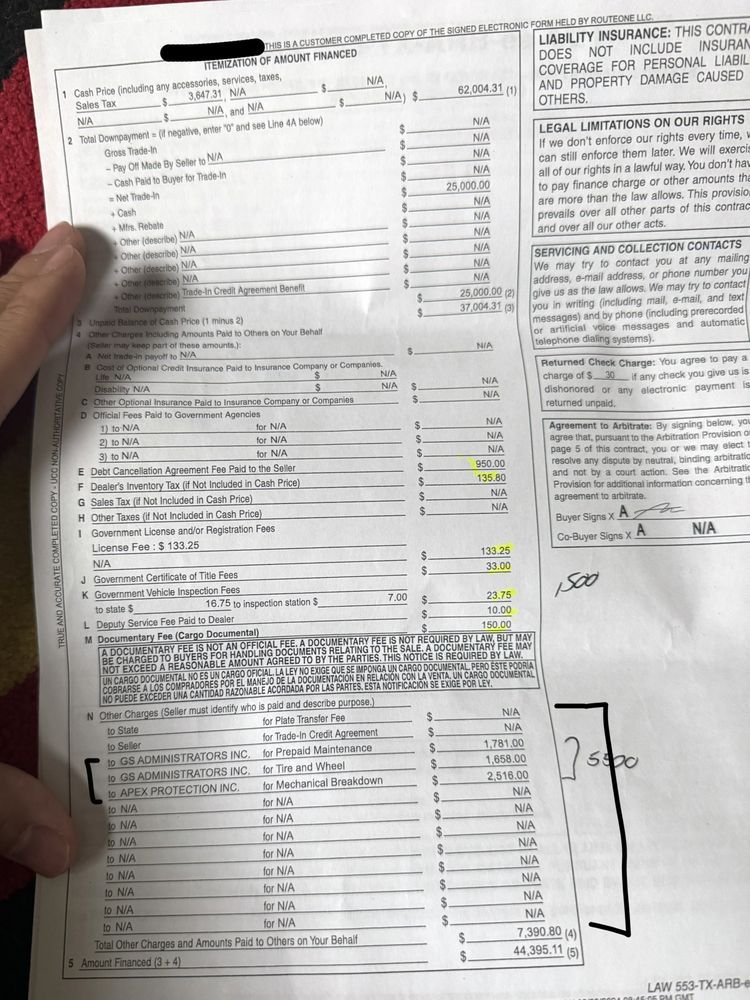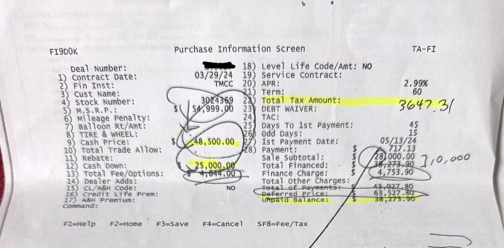 $ 25,000 down payment by this fraudulent menu showing NO Cost for all of the aftermarket optional products offered! Reference top of page $48,500 less 25,000 down payment, + includes only fees of $350.00 and Taxes $3,167.05 Where is the option to decline all Optional products and where is the true payment for purchase with out any optional products and additions taxes added.