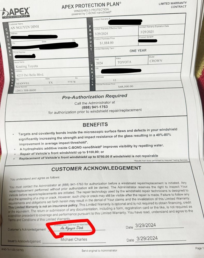 $1884.00 WINDSHILD PROTECTION ( ALL OF THESE PRODUCTS ARE TAXABLE)