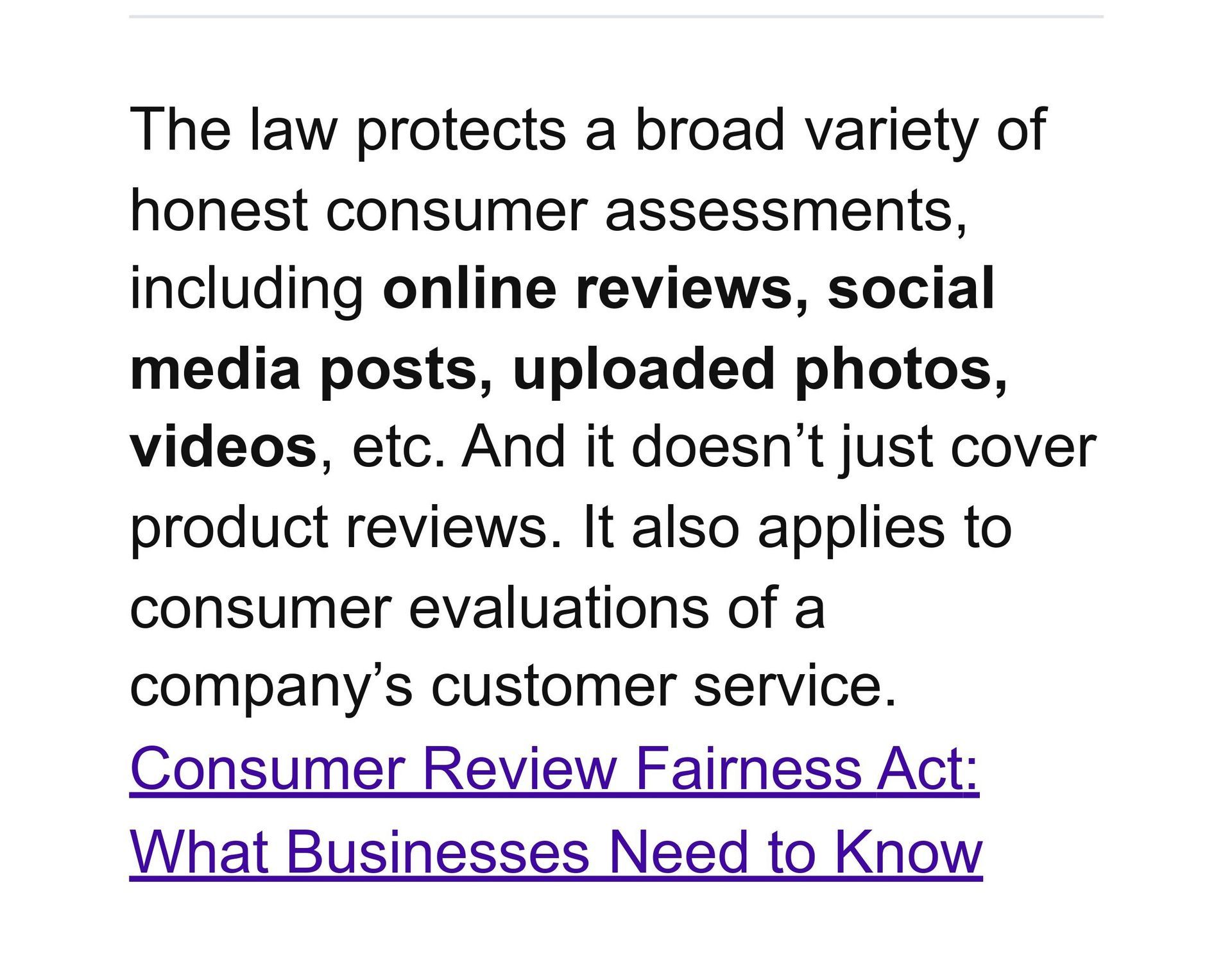 The Consumer Review Fairness Act (CRFA) protects people's ability to share their honest opinions about a business's products, services, or conduct, in any forum, including social media.