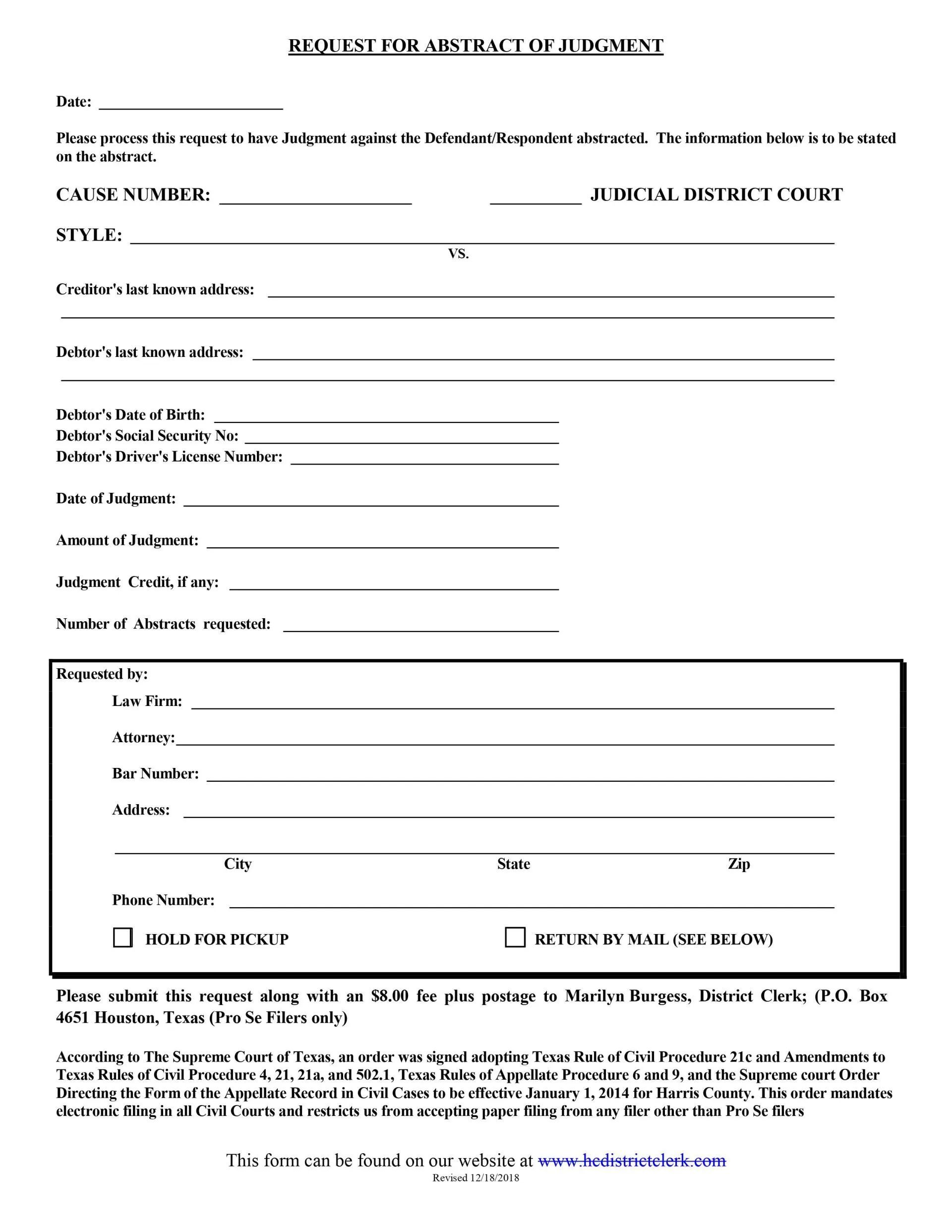 You are entitled to request from the Clerk's office a document called an Abstract of Judgment. When properly recorded pursuant to state law (such as in a County Clerk's Office in a county where the defendant owns property), the Abstract of Judgment can give you a lien in your own name against the defendant's property. You will then have similar legal rights as any other civil judgment lien creditor, and this means you can collect the money from the defendant yourself. You must bear the cost of recording the Abstract of Judgment. If you request an Abstract of Judgment from the Clerk's Office by mail, you must include a self-addressed and stamped envelope.